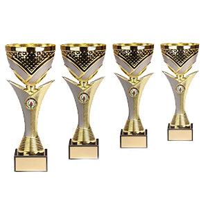 Cup Features Decorative Gold Flame Cuts With White Accents For That Extra Special Award.Comes With Custom 1" Insert. Great For Logos.