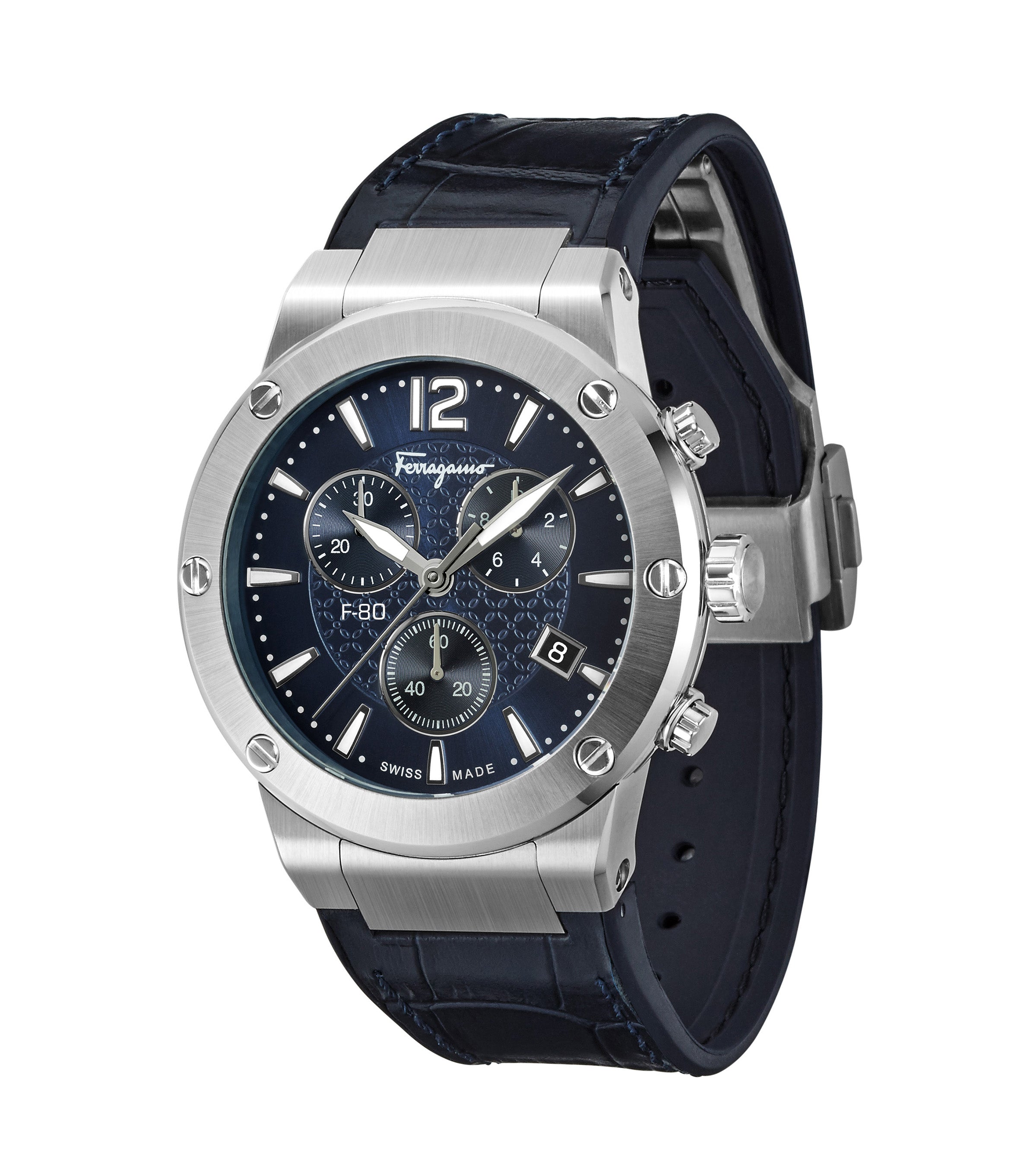 Its sport-luxury spirit has made F-80 a bestselling Salvatore Ferragamo Timepieces line. It outsmarts itself with chronograph version. Swiss Made.