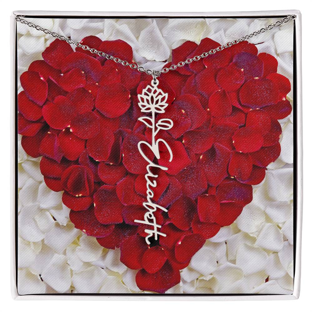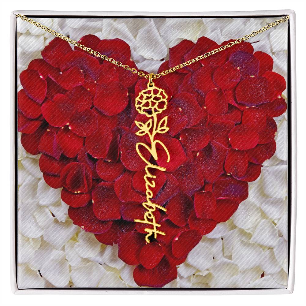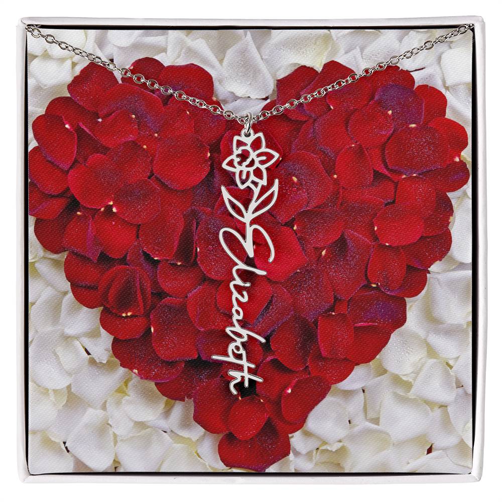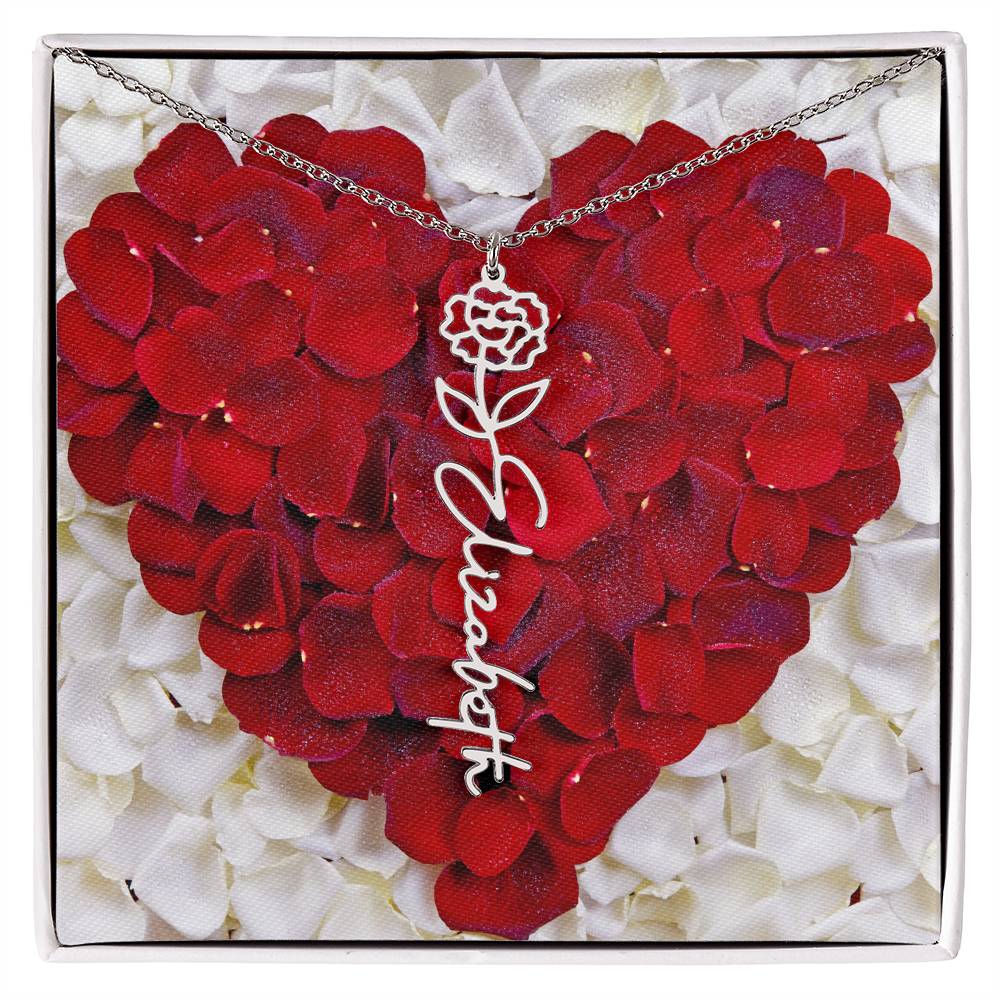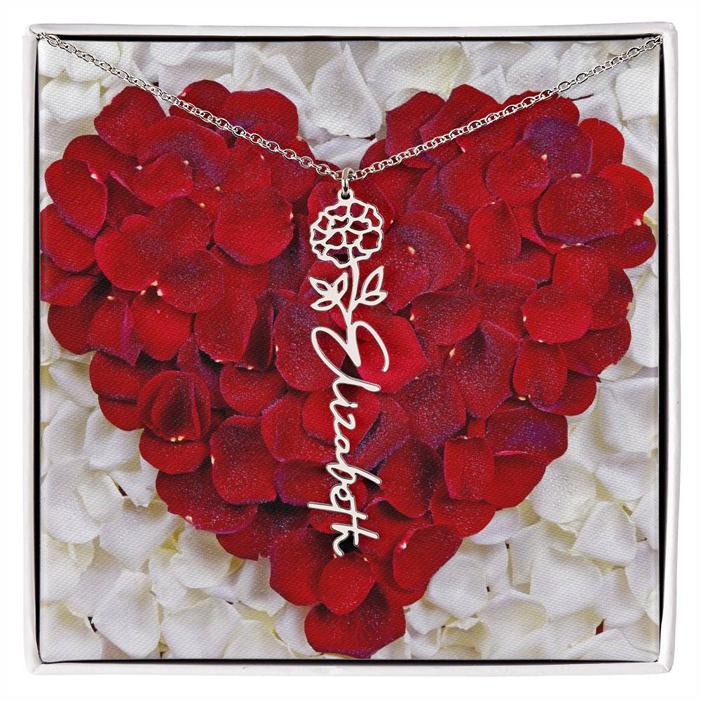 Featuring a delicate birth flower design seamlessly intertwined with a name of your choice, this piece radiates beauty, love, and individuality. Whether it's for a birthday, anniversary, or simply a "just because" moment, this necklace is the ultimate way to celebrate life’s special connections.